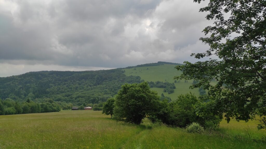 Od pustelni Św. Jana szlak schodzi do doliny Jasiołki (końcówka zejścia jest bardzo stroma) i drogi krajowej prowadzącej z Dukli na Słowację przez przełęcz Dukielską. Na otwartych przestrzeniach możemy podziwiać rozległe widoki na okolicę, ale jednocześnie z niepokojem patrzymy na kłębiące się powyżej chmury. Zwiastują one jak nic niechybne opady deszczu.