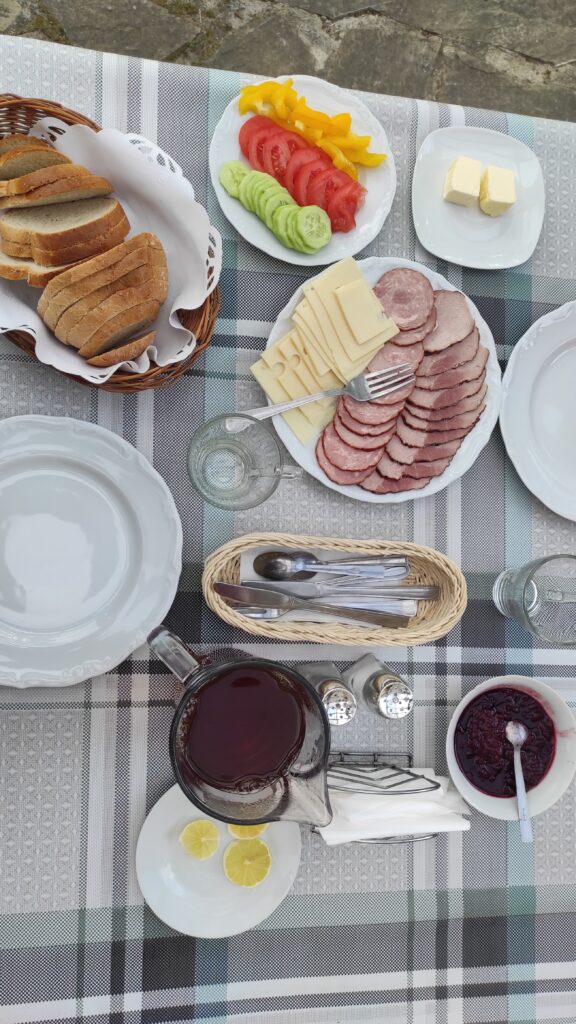 Zasadniczo nie przyrządzają tu posiłków dla wędrowców na szlaku, lecz jedynie dla osób nocujących w schronisku. Ale przemiła właścicielka pensjonatu obiecała przygotować nam śniadanko. Czwartek rano, Boże Ciało, wszyscy mieszkańcy albo jeszcze śpią albo już wyruszyli na szlak, byliśmy więc sami. Usiedliśmy przy stoliku z drugiej strony schroniska. zrzuciliśmy buty aby stopom dać chwilę wytchnienia i cierpliwie czekaliśmy aż podadzą nam śniadanie.