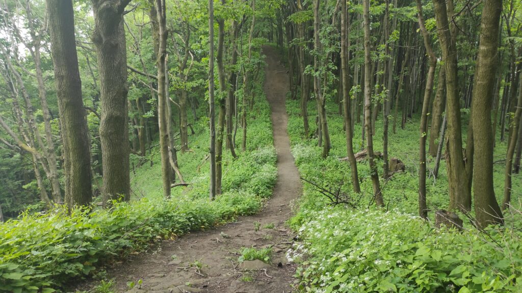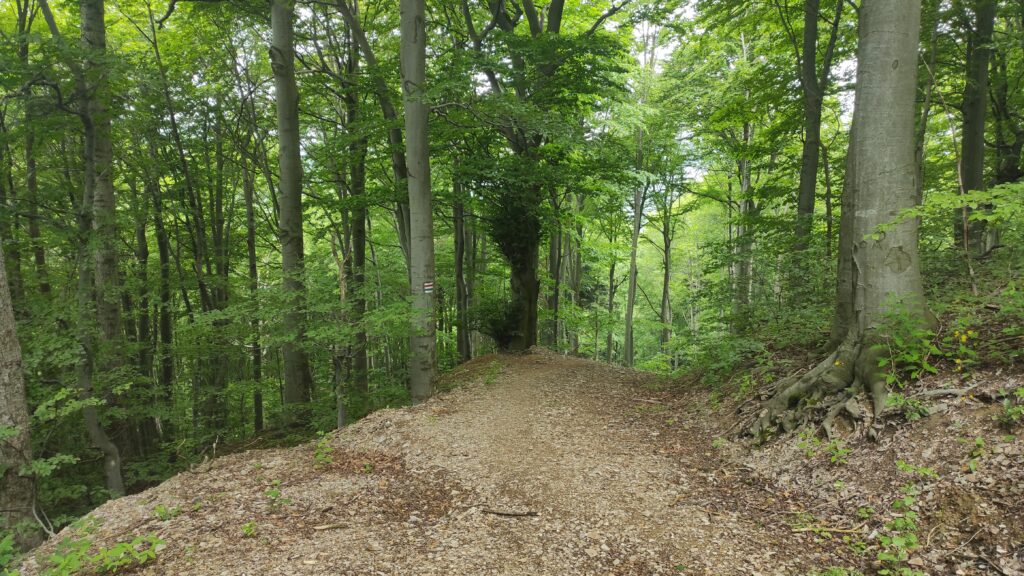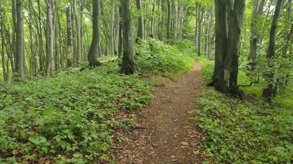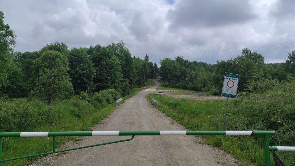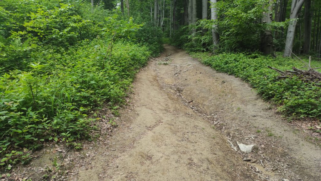 To obfite śniadanie chyba tak nas niosło do przodu. Dopiero po paru minutach zorientowaliśmy się że szlak idzie równolegle ale przez las. Szybkie zerknięcie na mapę i stwierdzamy, że tym razem nie musimy się wracać do miejsca odejścia szlaku, ani też przedzierać przez krzaczory żeby wejść na szlak. Droga kończy się przy żółtym szlaku, a ten dochodzi do czerwonego.