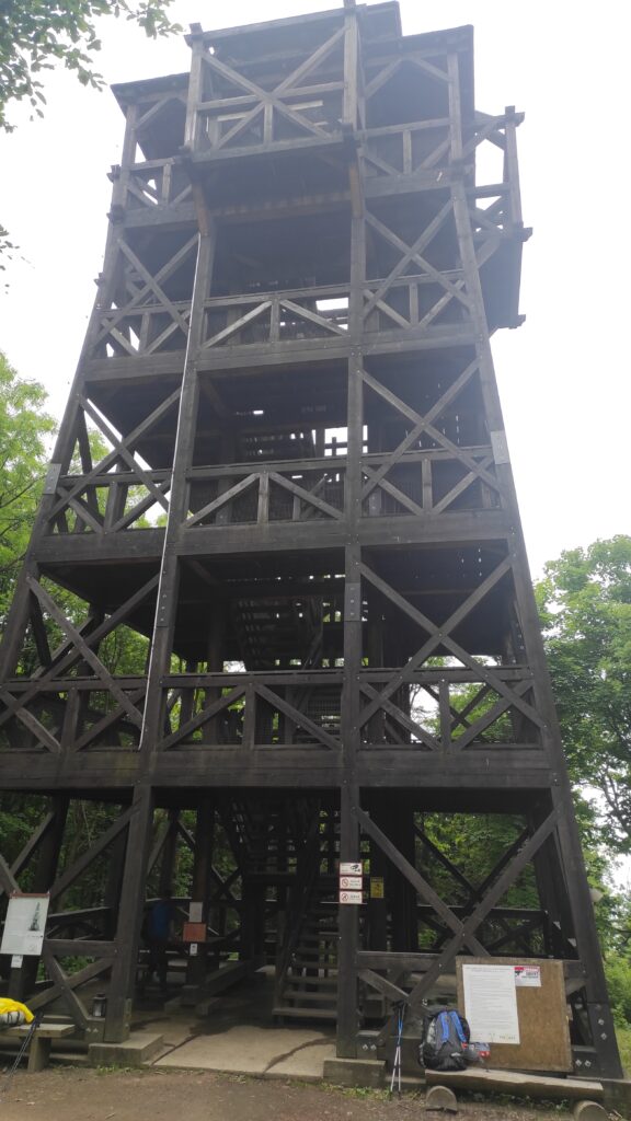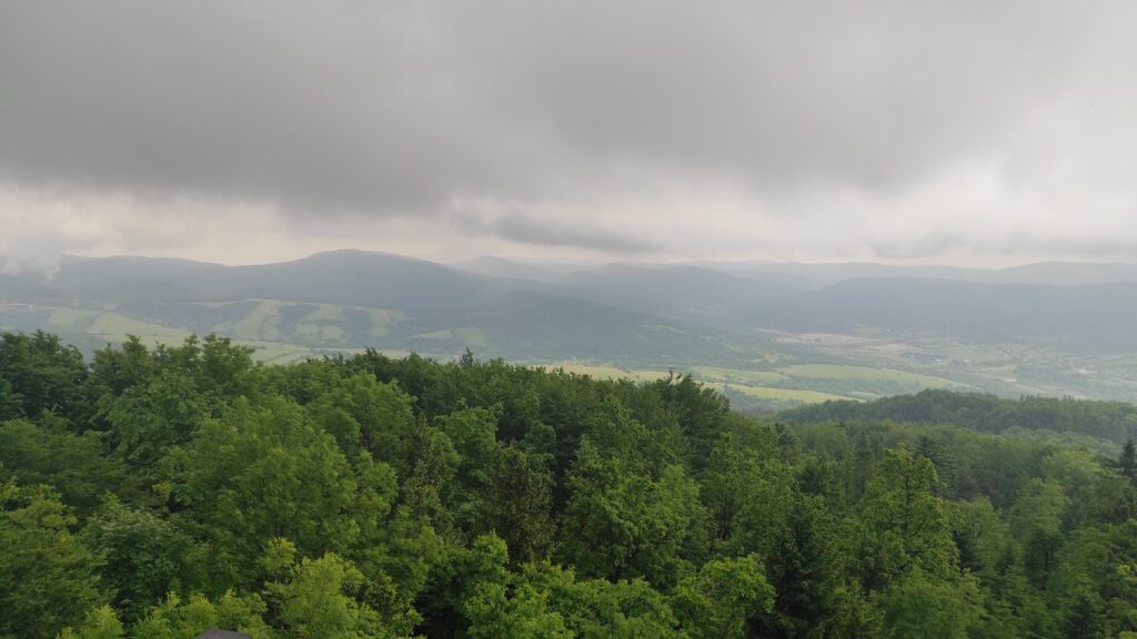 Na Cergowej zrobiliśmy sobie przerwę obiadową. Zjedliśmy resztę kanapek, które nam zostały z rana, popiliśmy wodą z elektrolitami. Marcin w międzyczasie smarował swoją obolałą nogę a ja skorzystałem z okazji i wszedłem na wieżę widokową, żeby podziwiać z wysokości okolicę.