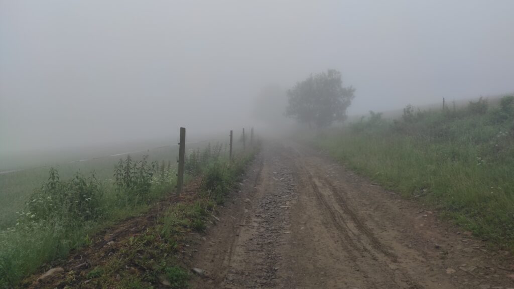 Deszczu na razie nie ma, jest pochmurno. Droga miejscami jest bardzo błotnista ale ciśniemy do przodu krok za krokiem. Widoków nie było żadnych, dookoła gęsta mgła.