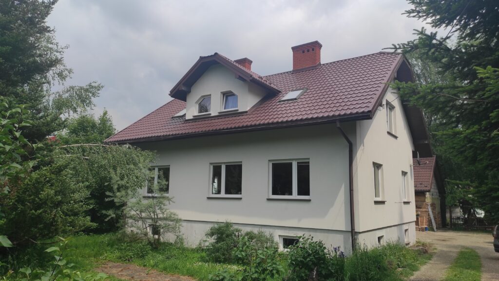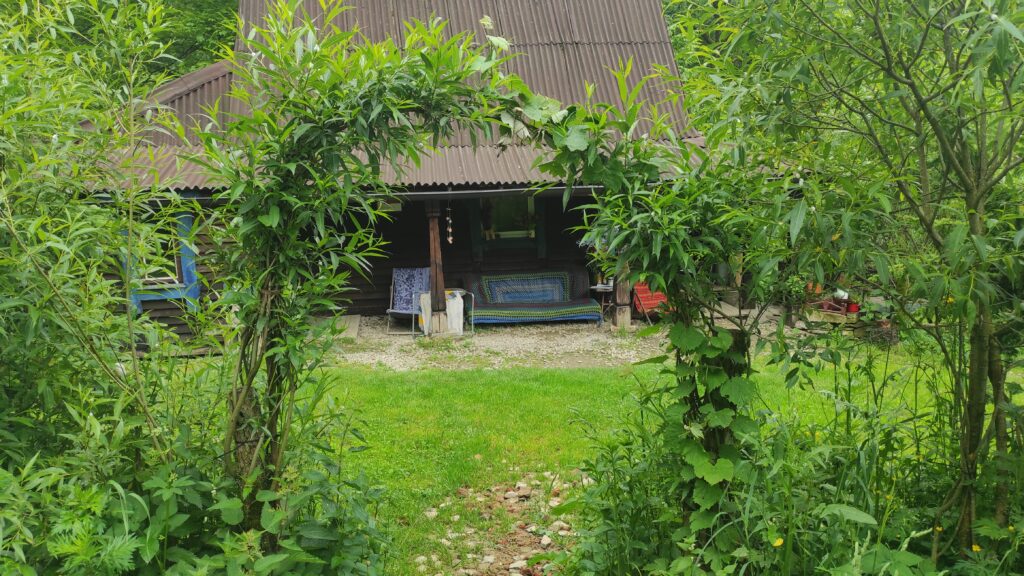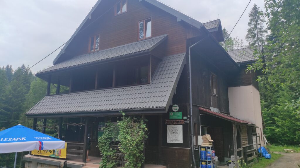 Wkrótce szlak skręca w prawo i przez krótki odcinek prowadzi drogą gruntową. Znajduje się tu kilka zabudowań, a prawie na końcu po lewej stronie niezwykle gościnna Chata w Przybyszowie. To miejsce na szlaku w którym można zanocować. Nie wchodziliśmy do środka więc nie wiem jakie są tam warunki. Jedynie młoda dziewczyna wyszła na chwilę pytając czy chcemy może kawy lub herbaty. Od niej dowiedzieliśmy się ze dziś nikt tu nie nocował. I to wyjaśniło dlaczego do samej Chaty nie spotkaliśmy nikogo idącego szlakiem. Tylko my i GSB. Ale są dni kiedy cała Chata się zapełnia. Miejsce jest niezwykle urokliwe i nocleg w takim miejscu na pewno jest super przygodą. Tym razem nie po drodze nam było.