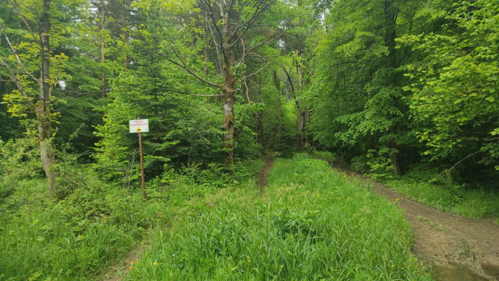 Wkraczając w las napotykamy ostrzeżenie o możliwym spotkaniu z niedźwiedziem.