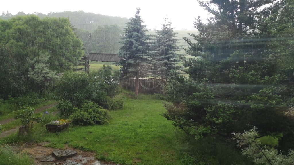 Siedząc tak przy deserku i gwarząc z niezwykle sympatyczną gospodynią K85 oraz dwoma dziewczynami które również wędrują szlakiem GSB ujrzeliśmy przez okno intensywne opady deszczu.