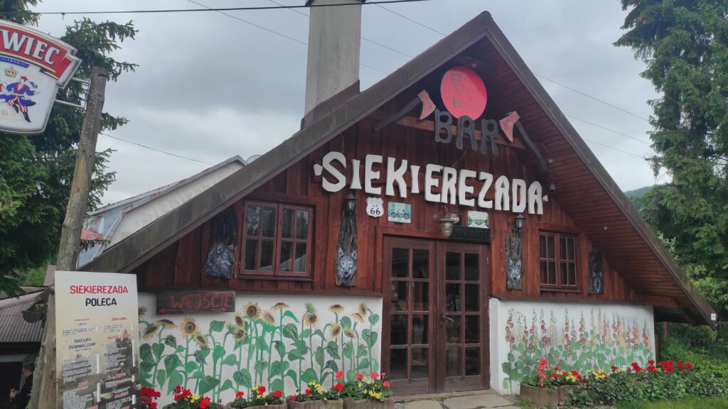 Wyszliśmy z Bacówki pod Honem punkt 9 po obfitym śniadaniu. Do Cisnej mieliśmy około 15 minut spacerkiem. Po drodze zrobiliśmy zakupy w sklepie oraz w aptece. Podeszliśmy również na chwilę pod słynną Siekierezadę, która była jeszcze nieczynna o tej porze.