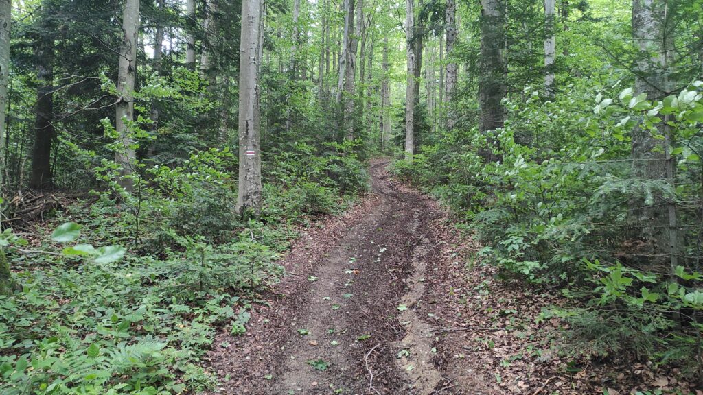 Potem za torami odbijamy w prawo i po chwili konsternacja. Szukamy szlaku po dojściu do potoku przecinającego naszą drogę. A wokół kilka różnych wydeptanych ścieżek. Po chwilowym błądzeniu odnajdujemy czerwony znak na drzewie i ruszamy pod górę.