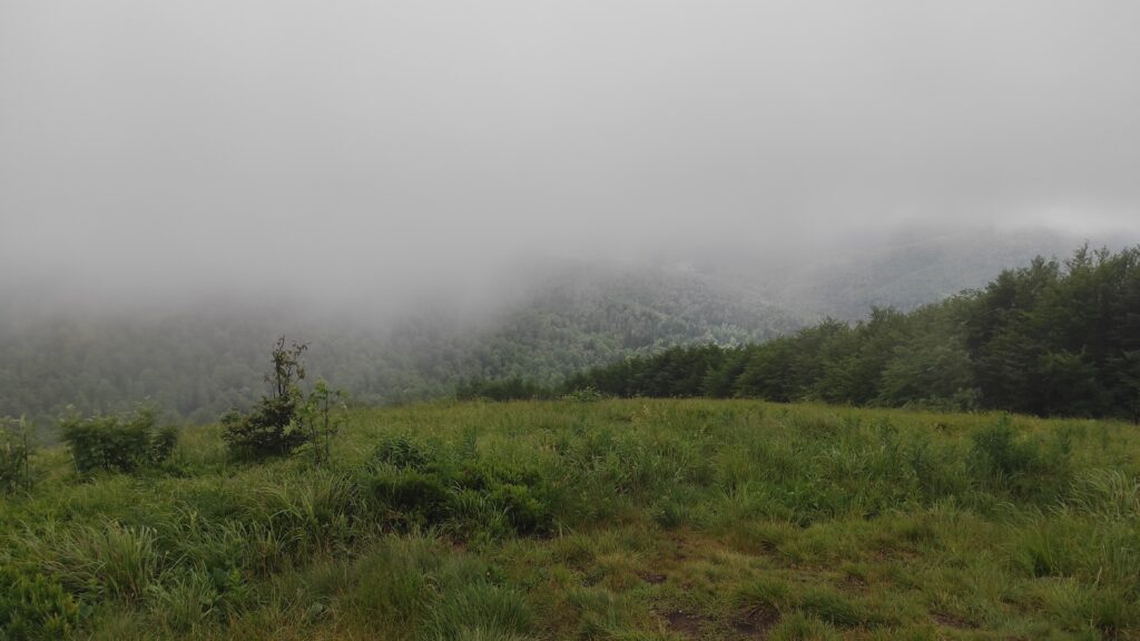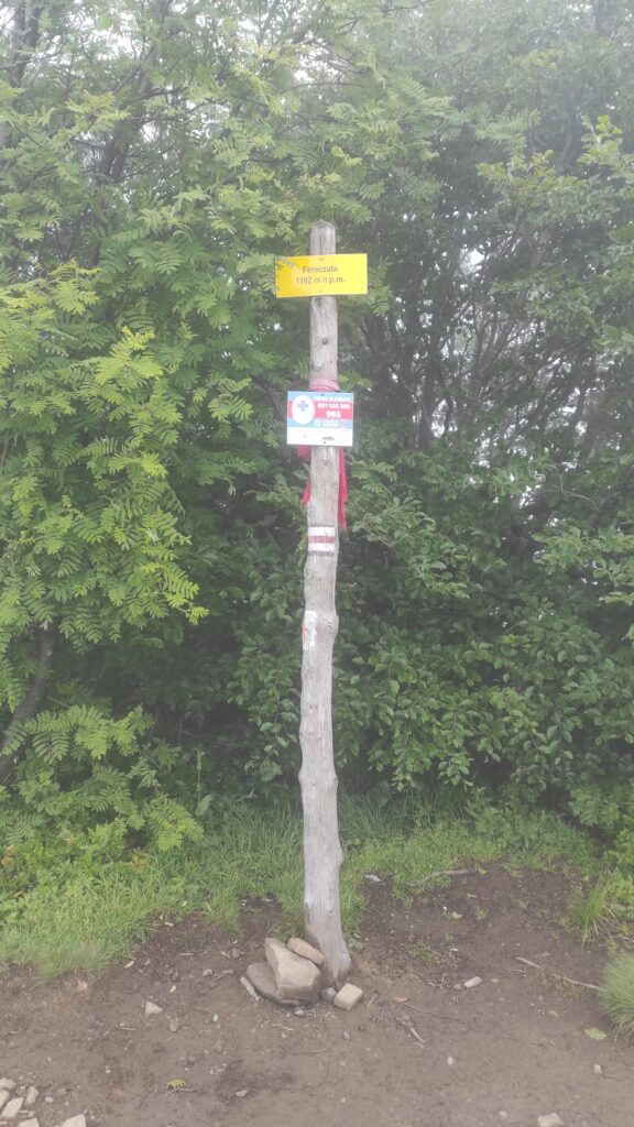 Kolejną kulminacją na trasie jest Okrąglik przy granicy ze Słowacją. Jak wyczytałem w przewodniku trzeba tu uważać żeby nie pomylić znaków Głównego Szlaku Beskidzkiego ze słowackim czerwonym szlakiem granicznym. Mi udało się bez problemu i w tej gęstej mgle dotarliśmy na kolejny szczyt tj. na Fereczatą (1102 m npm).