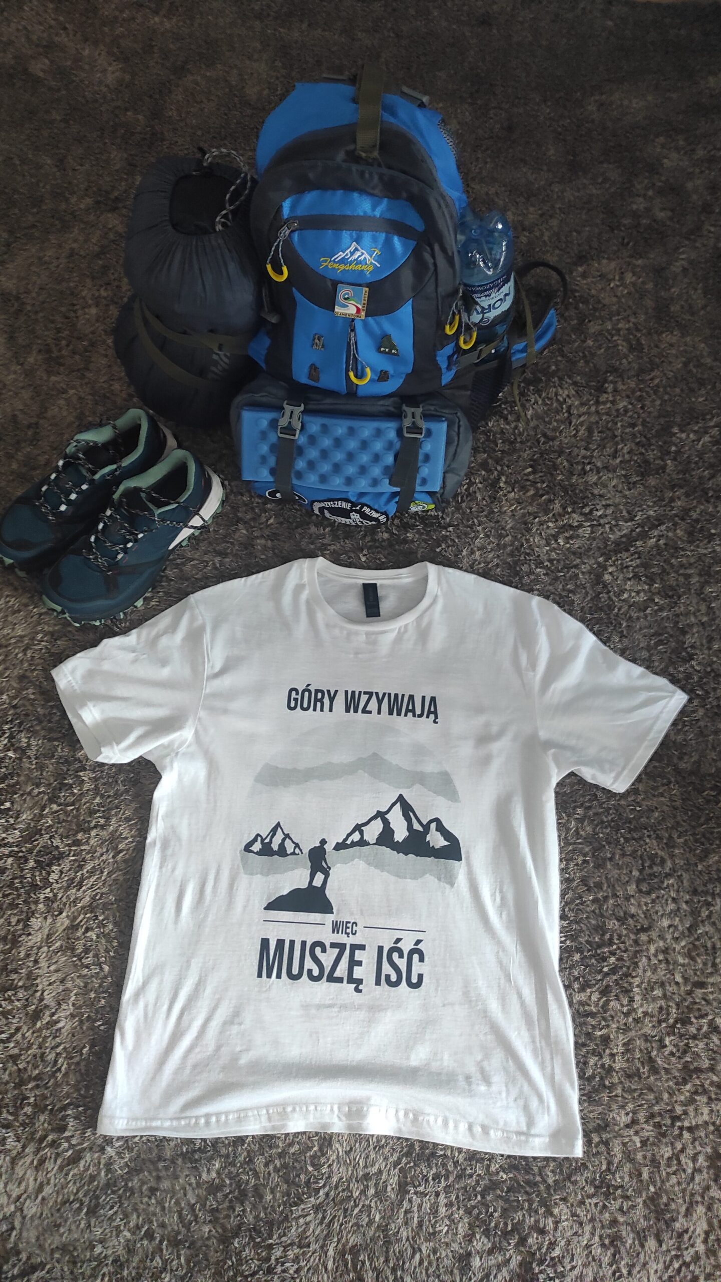 Plecak widoczny na zdjęciu waży około 9 kg. Spakowałem tam w większości wszystko to co planuję zabrać na szlak. Dojdą oczywiście jeszcze kijki, dodatkowa koszulka na przesyłkę której jeszcze oczekuję. Ponadto w nerce na biodrach będę miał telefon, selfie oraz półtlitrową wodę do bieżącego użytku.