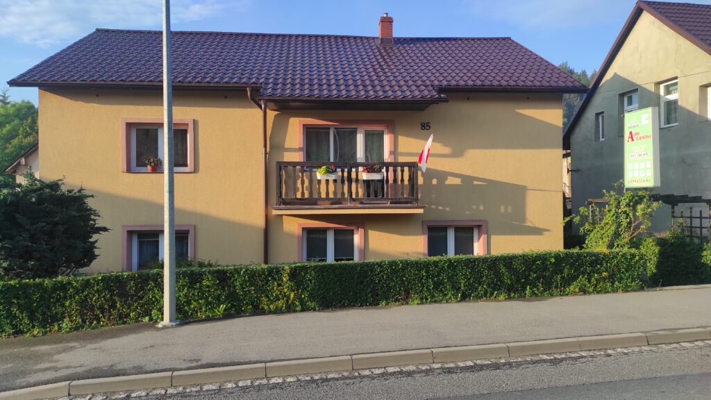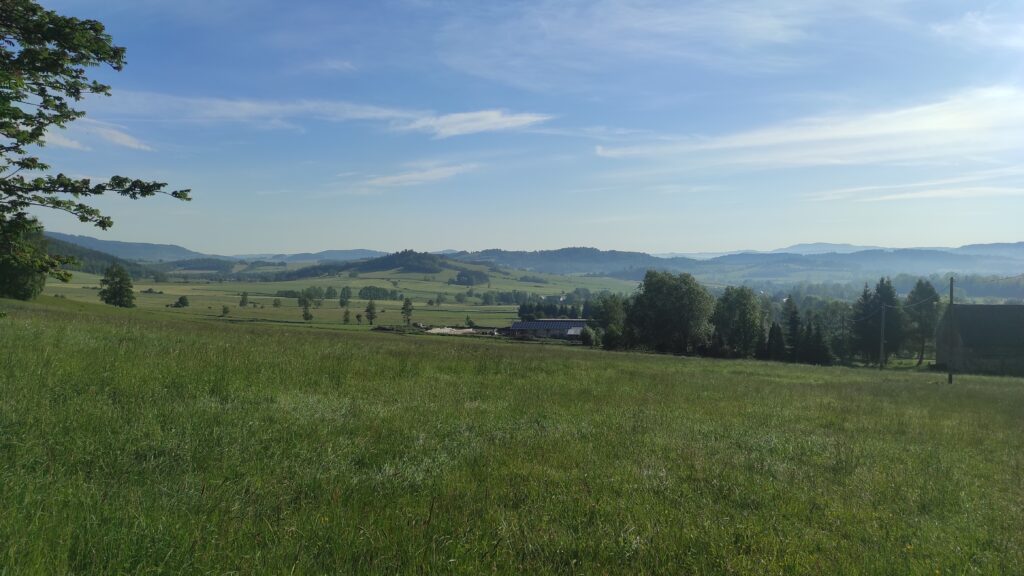 Nasyciłem oczy i duszę pięknym widokiem na Zadziernej i ruszyłem ostrym zejściem w dół. Szlak doprowadził mnie zboru do asfaltu i znowu towarzyszył mi do kolejnej wioski, która była Lubawka. E ogóle dzisiejszy szlak wyglądał w ten sposób: wioska, wzgórze leśne, wioska, wzgórze leśne i tak kilka razy.