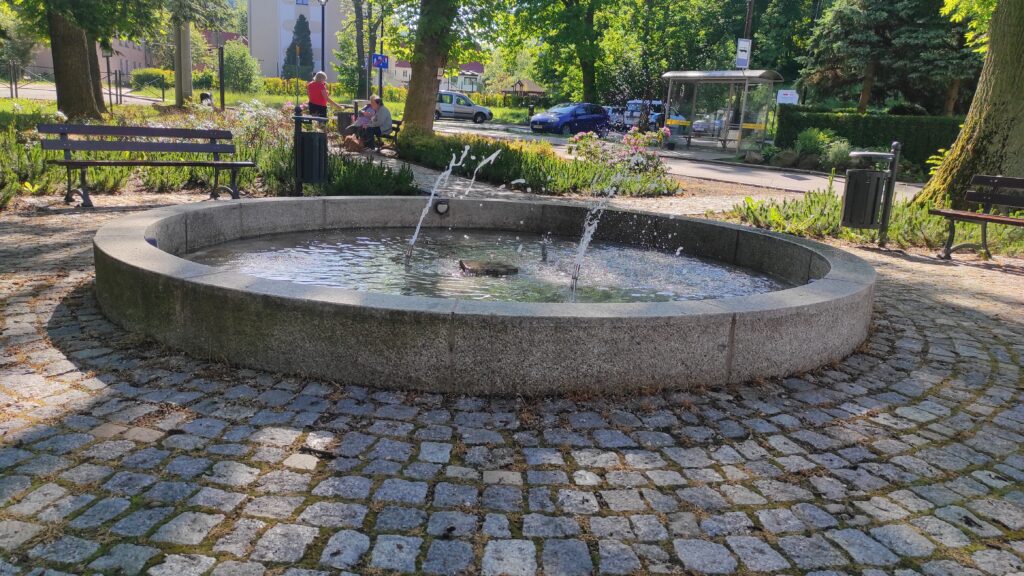 Tu robię pierwsza dłuższą przerwę. W sklepiku kupiłem pączka, jogurt i czekoladę. Wietrzenie stóp w mini parku przy fontannie i nabieram sił na główne dziś podejście na Bukowiec. 300 metrów w górę na długości 1 km.