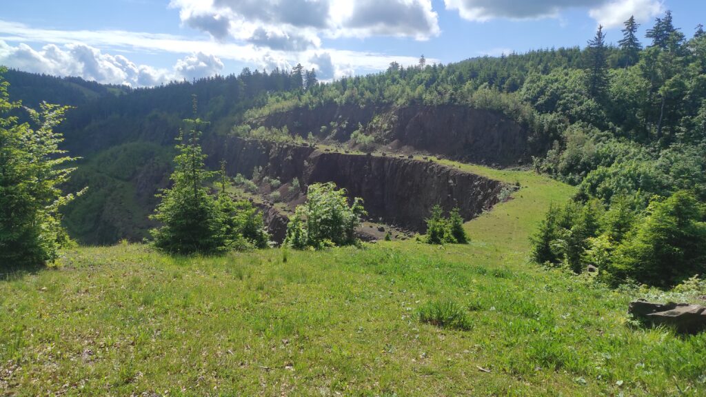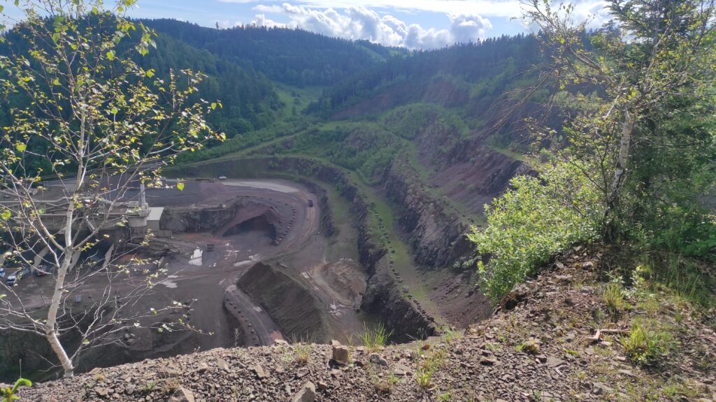 Jak się okazało to teren kopalni melafiru. Ze szlaku nie widać kopalni ale 200 metrów od szlaku jest świetny punkt widokowy na to niesamowitych rozmiarów miejsce.