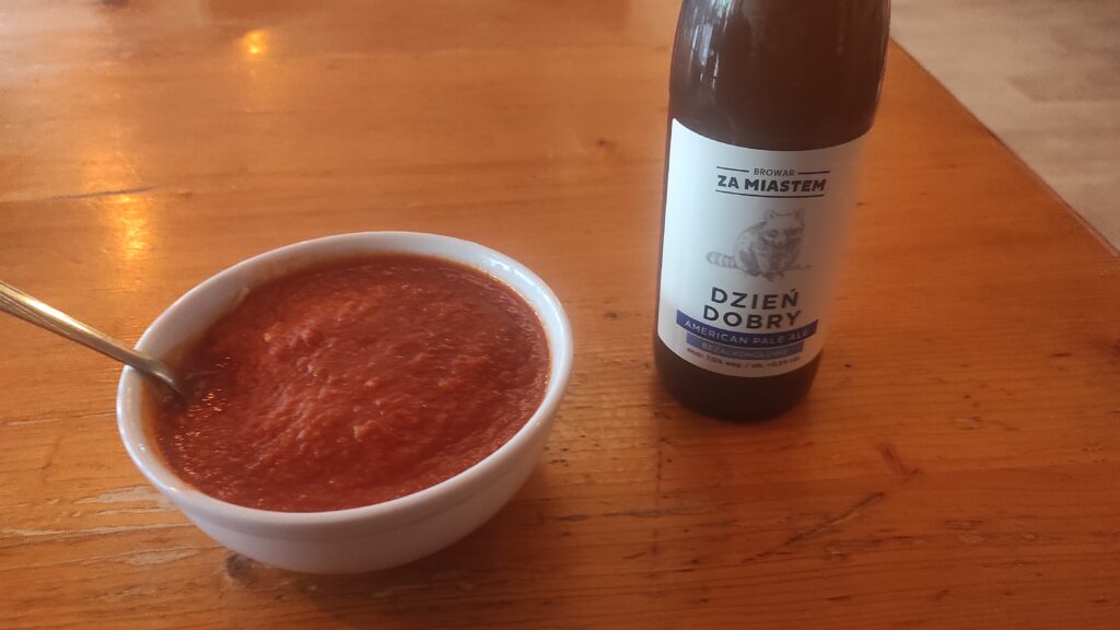 Zamówiłem pomidorową (która wyglądała bardziej na przecier pomidorowy) z makaronem i miejscowe piwo bezalkoholowe o wdzięcznej nazwie „Dzień dobry”.