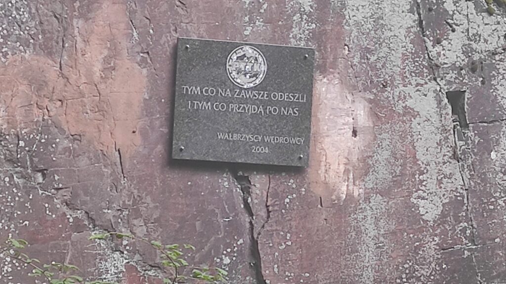 Od Schroniska idziemy przez Halę pod Klinem i dochodzimy do skalnej bramy z napisem: „Tym co na zawsze odeszli i tym co przyjdą po nas”. Tablicę tę pozostawili w 2004 roku wałbrzyscy wędrowcy.