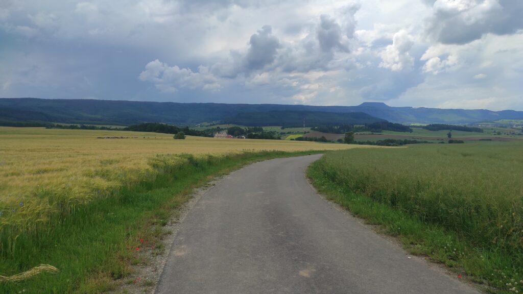 W Ścinawce uzupełniłem prowiant i ruszyłem na kolejne wzniesienie. Z jego szczytu w oddali pięknie prezentowała się panorama Wambierzyc.