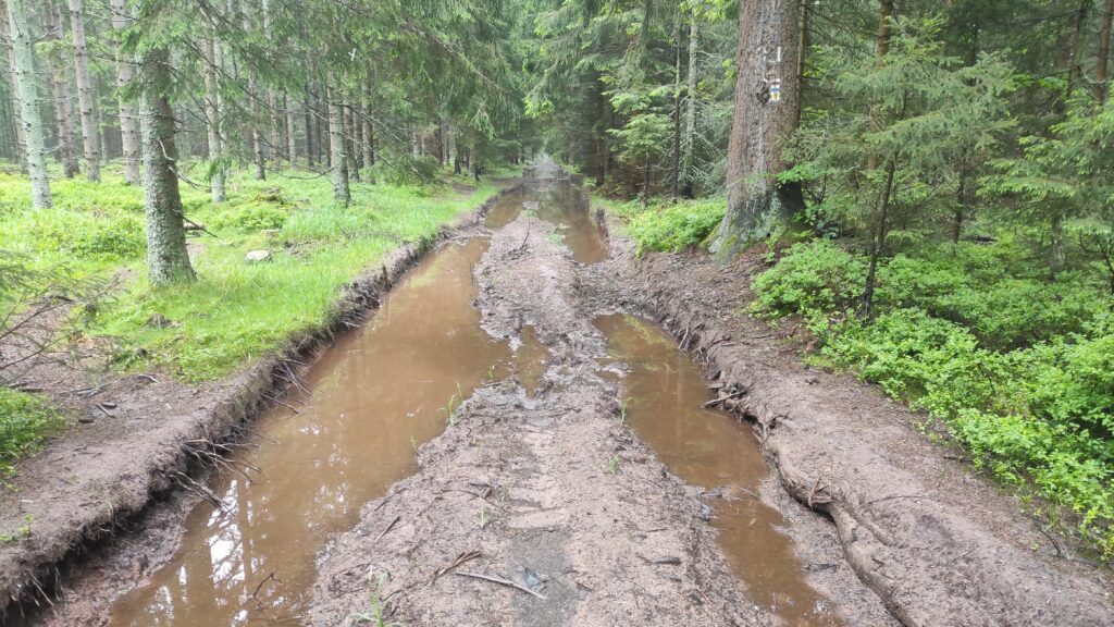 Ciężko się lawiruje między takim kałużami na szlaku. Trzeba obchodzić leśną ściółką takie bagna. Na razie jakoś się udaje i oby tak dalej. Pogoda jak na razie idealna. Przestało padać jest chłodno, wędruje się przyjemnie. Tuż przede mną przebiegło stadko kilkunastu saren i jelonków. Ostatni zatrzymał się na chwilę i zlustrował mnie wzrokiem kto to śmie zakłócać spokój jego gromadce.