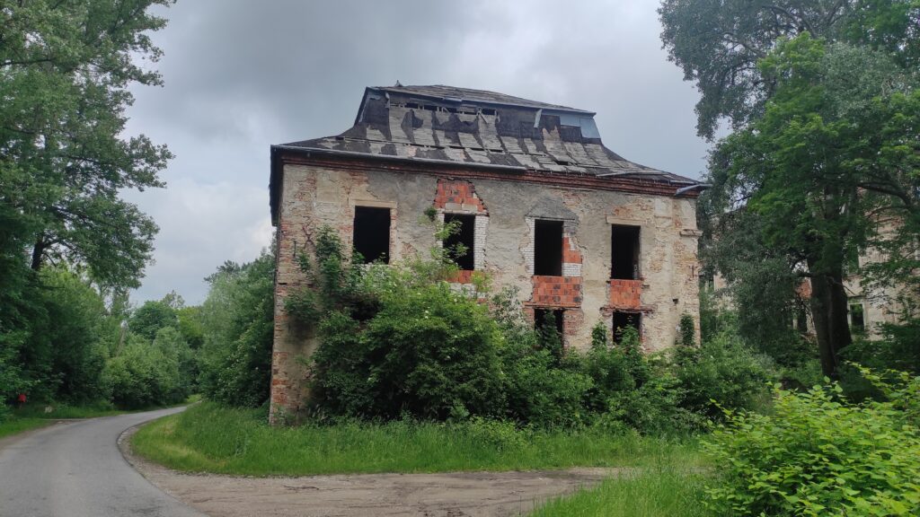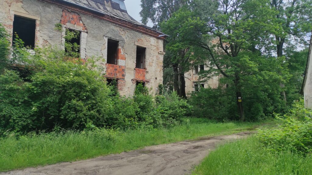 Szlak znowu prowadzi szosą w stronę Wilkanowa. To wieś która mocno ucierpiała w czasie powodzi w 1997 roku. Po prawej stronie mijam zrujnowane pozostałości zespołu pałacowego i sąsiadujący z nimi XVII wieczny kościół Św. Jerzego.