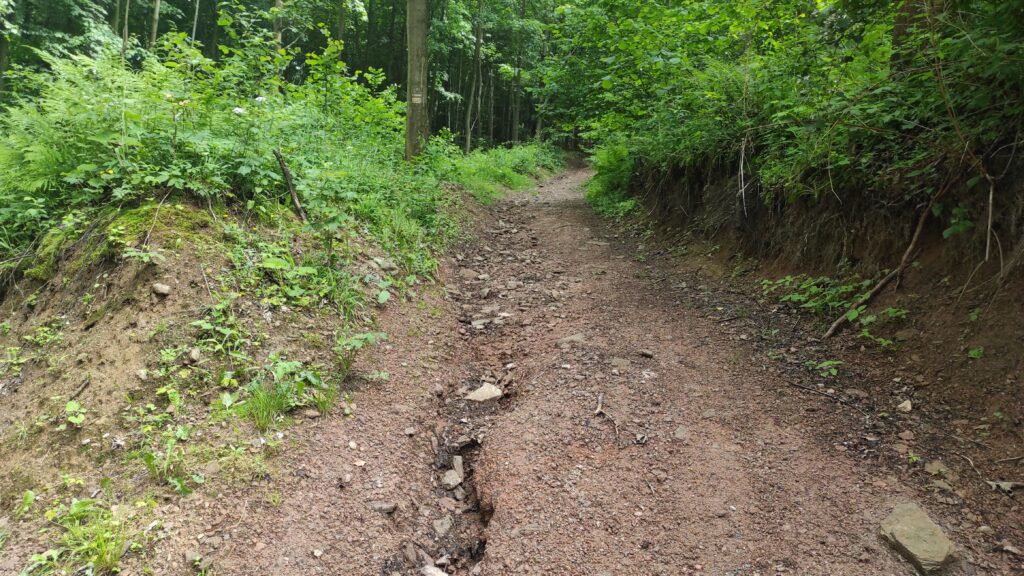 Dwie i pół godziny drogi już za mną. Czas szybko płynie. Szlak w większości wiedzie przez las. Jeśli jest droga utwardzona to idzie się dobrze. Jeśli trafiam na zwykłą leśną to mam deja vu poprzednich dni.