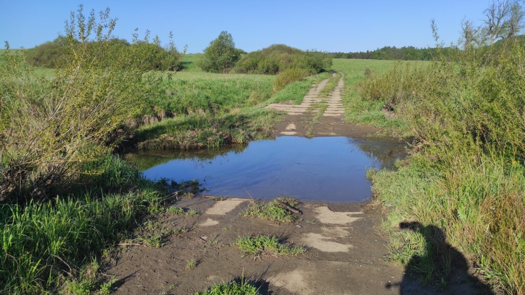 Wkrótce po wejściu między pola czekała na nas niespodzianka. Oto szlak przeciął wylany potok.