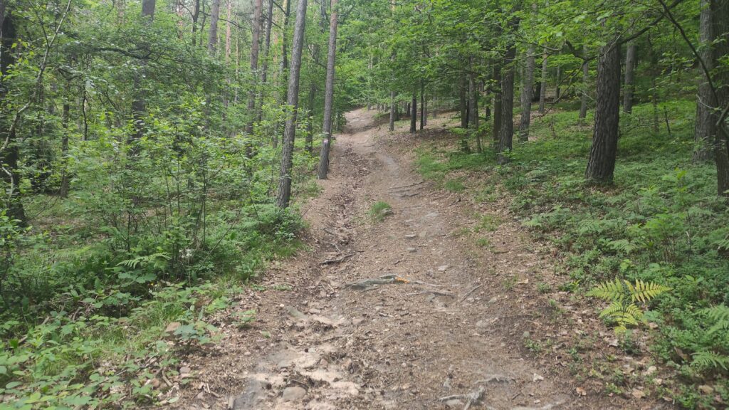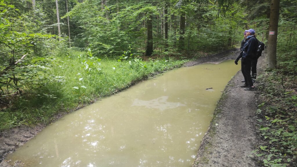 Szlak prowadzący dalej przez las pozwala mi przypomnieć niedawna karpacką przygodę. Znowu pojawia się błoto na szlaku. A miejscami kałuże są długości kilku metrów.