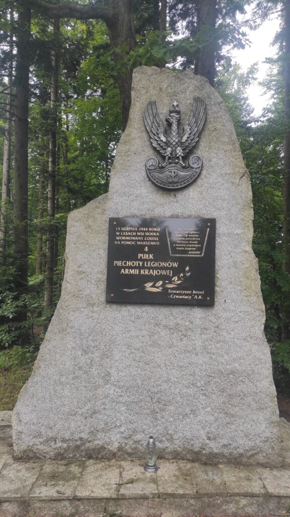 Ścieżką przez podmokłe tereny dochodzimy do polany i dalej do szosy przy której stoi pomnik pamięci 4 Pułku Piechoty AK.