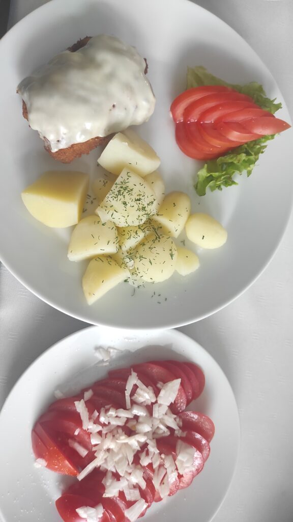 Po kilkunastu minutach dochodzimy do drogi krajowej 73 i idąc wzdłuż ekranu dźwiękochłonnego schodzimy z czerwonego szlaku około 100 metrów żeby wstąpić do restauracji Krystyna na zasłużony obiad. Zamawiany żurek, rosół, danie dnia w postaci zalewajki i ryby smażonej oraz kotlet świętokrzyski.